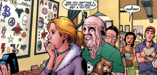 Wanting to rid herself of her gang member tattoo, the girl goes to a parlour to get the tatt adjusted into something else. As the artist is finishing her arm, Harmony enters the place, complete with entourage and dogs, and her new assistant: former Sunnydale resident Clem!