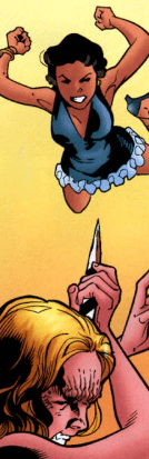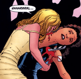 Harmony drops the dog she was holding and is stunned as it races down the steps, distracting the girl and landing on Clem’s head! The girl and Harmony collide, landing with a thump. The girl pushes Harmony’s head against the floor, but Harm, now aware that she’s fighting a Slayer and absolutely petrified, vamps out. She back hands the Slayer off her and reaches for the clapper board. The girl kicks out, sending Harmony off the balcony they’re on, down towards the horrified onlookers below.