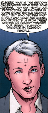 “Slayers. What is this shadowy organisation? We’ve done some digging. They say they’re our protectors, as fighters in some grand battle against ‘evil’. But who decides what is evil? And, some are asking, who protects us from them? Keeping us honest tonight, our guest, television personality, Harmony Kendall!” He even introduces the dogs.