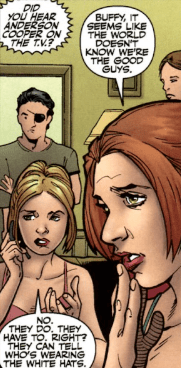 After all, surely the public can tell who the good guys are from the bad? Who’s wearing the black hats and the white hats, right? Willow looks worried. And now, so is Buffy.