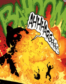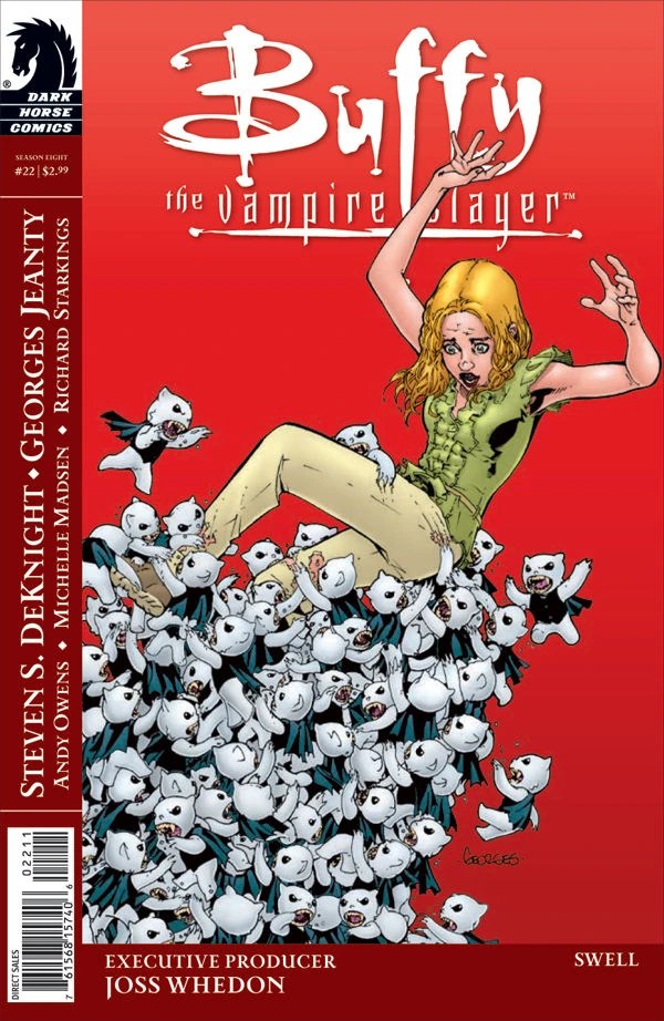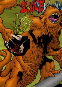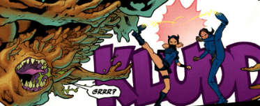 The girls are engulfed by the soft menaces, slicing and dicing the critters as fast as they can, but there are too many of them. They’re trying to get inside the Slayer’s mouths, presumably to hide away, but the girls stay just ahead of them. One of them turns and snarls at them: “My death is meaningless Slayer scum! Nothing can stop the Swell!”