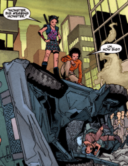 With a grin, her gun still smoking, clutching a parachute from somewhere, is Kennedy. The first thing Kennedy tells her is that she should have ducked at the tail. Satsu is not thrilled to see her fellow Slayer, but Kennedy says she was simply in the neighbourhood and thought she’d, you know, just drop in and electrocute that whatever-it-was. Satsu thinks Buffy has sent her to check after her. Kennedy asks if she thinks that’s unreasonable? Her reports out of Tokyo have been sketchy at best and she’s only been in charge of the Squad for a few months. “Stop being such a brat,” Kennedy tells her ironically. “That’s my job.” Kennedy is here to do Satsu’s evaluation: simple as that, because it’s her job.