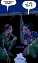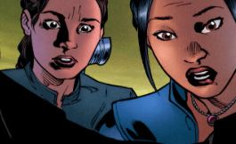 Satsu picks up where she left off: she doesn’t need the other lesbian Slayer to check up on her, but Kennedy delivers a kicker: Buffy didn’t actually send her – Kennedy volunteered. She’s concerned – she wouldn’t want her to fall for a straight girl, especially for a one-night stand. Satsu claims that their relationship was deeper than that, but Kennedy hits back: that doesn’t mean Buffy is gay or interested in more. She tells her to toss her cinnamon lip gloss and find someone else. Going after Buffy will only end up hurting Satsu. Once she’s finished, she stops the conversation dead – she won’t bring it up again. Satsu sighs and walks over to the bag the creature dropped. Curious, the girls open it – and are stunned by what they find inside!
