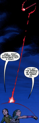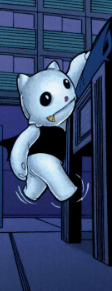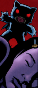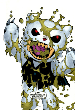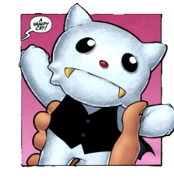 As Satsu falls, she vomits, an unsettling green goo. From the goo, dripping wet, the Vampy Cat emerges, red eyes, teeth drawn and yelling loudly: “I am discovered my brothers! Use what I have given – strike at the heart of the Beast!” With that, he’s sliced apart by Kennedy. Everybody looks at the former stuffed toy in morbid curiosity, all except Satsu. She looks down at her clothes and shrieks: “What the Hell am I wearing?”