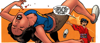 She’s wearing a red kimono, a furisode. They are bought for girls to wear when they come of age and are ready to be presented to society for marriage, Satsu tells her. She also ruined her parent’s dream of her ever wearing one when she came out, so she thought she’d give it a go. Kennedy immediately notices her strange behaviour, especially when she starts hurling homophobic abuse at her. After trying to get Satsu, by now quite excited, to calm down, Satsu suddenly yells at her: “Take your stinking paws off me, you damn dirty Slayer!” – and backhands Kennedy across the room!