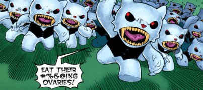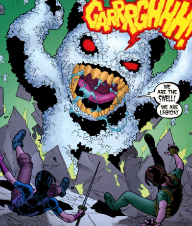 The two girls look at each other? The What-Now? The answer comes again, as thousands of the Vampy Cats come together and merge into a giant one! “We are the Swell. We are legion!” it roars, as it pounds it’s way towards them.