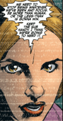 “We’re hated and feared more than the bloodsucking dead and Twilight just tried to murder us all with an army of stuffed animals. It’s way that bad. We need to stop being whatever we’ve been and focus. Be more than human or the less-than is going to win. Keep the sub handy. I think we’re going to need it.” With that Buffy signs off, the screen going blank. No goodbye, no nothing.