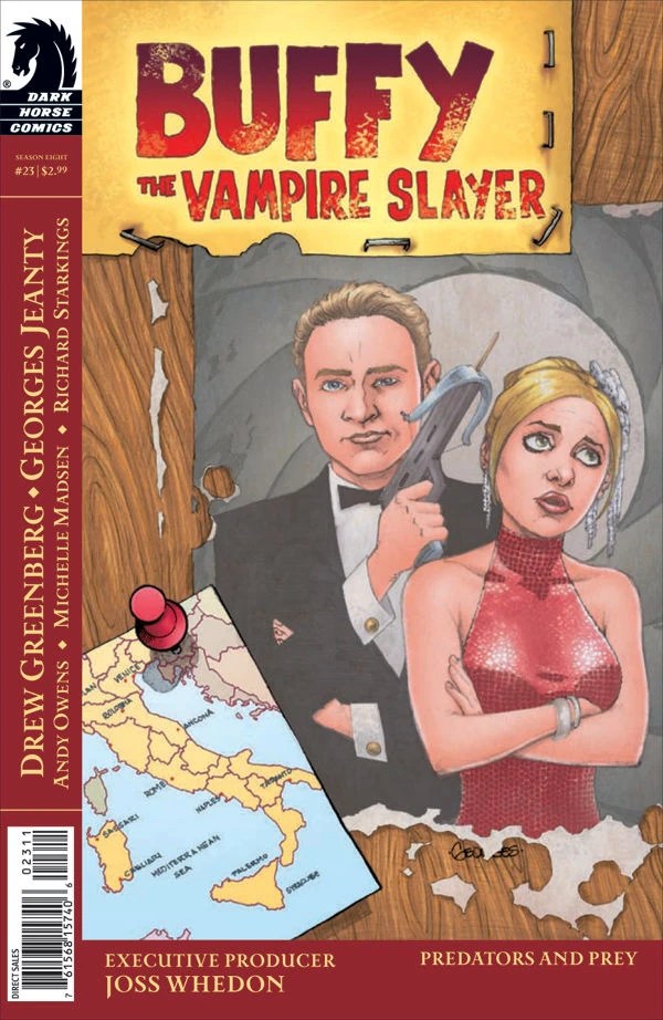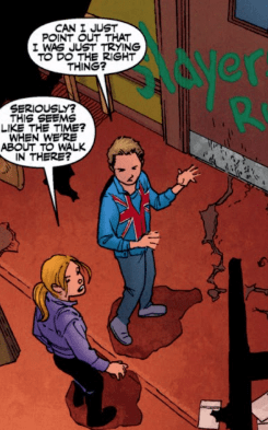 “Andrew, if you slam that door one more time I will make you eat it,” Buffy states, as Willow tells her off for her harsh words and obvious bad-moodiness. Xander asks Andrew to forgive their fearless leader – she’s more stressed about Harmony and her crusade to legitimise vampires than she’d admit. Andrew doesn’t let Buffy’s comment dampen his spirits. He’s bouncing up and down on the spot. He has a lead on Rogue Slayer, the gun-toting Simone Dofler. Buffy has been waiting for this confrontation and asks him how he found her. He said it wasn’t kind of him. It was her lieutenant Nisha. Andrew monitors certain demonic hot spots, and Nisha apparently got too close to a Ragna Spider demon. Just outside Milan. There are also reports of Simone and her Slayers roaming the Milan countryside, forcing people out of their homes. He also points out that if they’re going to move, they had better haul it: the Ragna Demons only keep their prey alive for a certain amount of time.