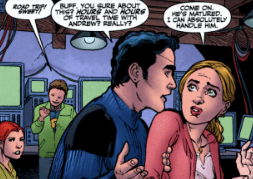 Buffy is keen, commanding Xander and Willow to watch the rest of the team ,whilst she and Andrew go to Milan to rescue Nisha and confront Simone. Xander stops her as she settles on her plan and takes her to one side. “You sure about this? Hours and hours. With Andrew?” Andrew is busy, preparing a road-trip. Buffy looks at him and then back at Xander. “Come on! He’s matured. I can absolutely handle him.”