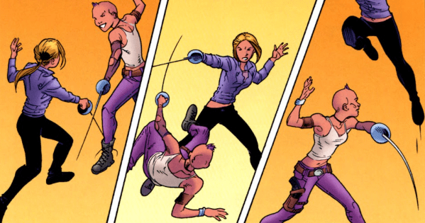 Buffy is steadfast. You’re not taking him. She launches into the Slayers around her, grabbing a blade and striking, Simone catching her thrust. As the two begin a sword fight, Simone tells her Slayers to back off: Buffy is hers. Using her skills, Buffy leaps towards the chandelier on the ceiling, bringing it down on Simone and gaining the upper hand. However, by the time Buffy retrieves her blade and aims it at Simone’s throat, Simone has a firearm in her hand – and it’s aimed at Buffy.