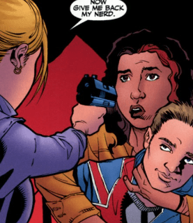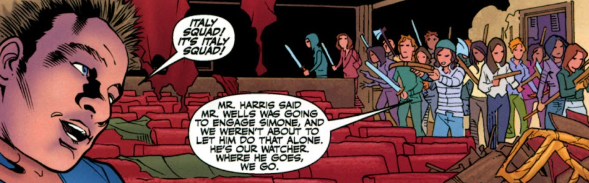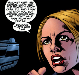 Simone tells her that’s a shame, especially since Buffy’s totally outnumbered, but a voice from the side of the auditorium stops her: the Italian Squad, Andrew’s Slayers, have arrived in the nick of time, weapons trained on Simone and her followers. They will be taking Buffy and Andrew – on Mr. Harris’ orders. Buffy orders them to start clearing the island, but the Slayers say they shouldn’t: the numbers and weapons are too high against them. Buffy remembers her promise to the little girl and curses herself. Damn it. “Fine. You can keep the island.” She snatches Simone’s gun from her hand and then levels it straight at the head of the Slayer holding Andrew.