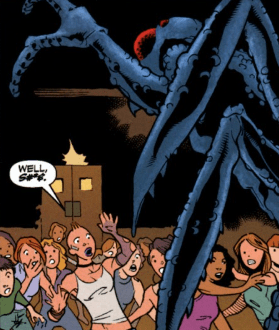 Buffy turns around to find a large, black spider approaching, at least the size of the car they left beyond. It’s red eyes flickering, it’s jaw mandibles clear as day. Nisha blames Andrew for getting her into this mess, but Buffy says that if Andrew hadn’t known about this through his tracking, she’d be dead. Nisha scoffs at her: Ragna Demons have been completely extinct since the eighteenth century. But someone had the idea to recombine their DNA in an attempt to recreate the species.