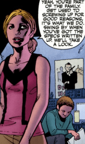 Buffy turns to go out the room. “Yeah, you’re part of the family. Get used to screwing up for good reasons. It’s what we do. Swing by when you’ve got the specs written up. We’ll take a look,” she says, and walks out the door with a smile.
