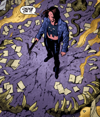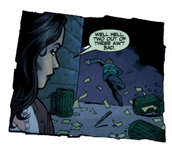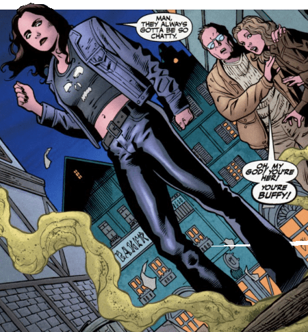 Three vampires are converging on a younger Faith. The year is 1998. She’s only just been called. She dusts two of the vamps, but misses the heart of the third. He runs away, mocking her mistake. She let him go and the deaths of all those he hurt afterwards are her fault. Faith shakes herself out of the moment and strikes at the Third!