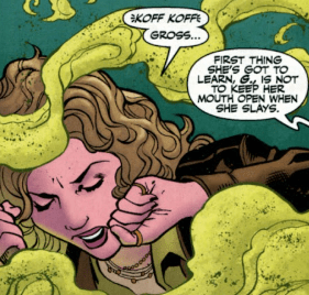 A vampire turns around, a stake in it’s back. “Ow,” it declares, turning back to it’s prey. A young girl, a Slayer, suddenly gets nervous. She yells out loud that she quits! The vampire gives chase and insists that he’s not going to hurt her, just bite her: hasn’t she heard? It’s all the rage. As he turns around a corner, he runs straight into a stake – and this one hits the right target and he collapses into ash. Faith Lehane stands there, job done. The young Slayer, now currently in the arms of Watcher Rupert Giles, yells in excitement: “Oh my God! You’re her! You’re Buffy!”