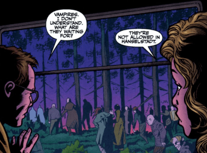 Approaching the town, however, Giles tells her to look out of the window. On the outskirts of the town, encircling it, are vampires. Throngs of them, all looking inward towards Handelstadt. They’re not allowed in, Courtney explains.