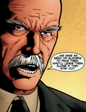 Giles gets up. The townspeople have been feeding their Slayers to the demon – in an effort to use the demon to keep the vampires out! Fullworthe reasons that as a Watcher, they’re used to sending Slayers to their deaths and that he’s found a way to save the town, but Giles thinks it’s revenge because he’s no longer needed or important. Fullworthe offers Giles a place in their community, but Rupert is getting up to walk away.