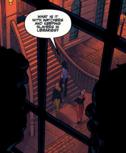As Faith and Courtney head through the town towards the library, Faith can’t help but feel that she’s being watched and that all of this is some kind of trap. She also notices that there are no children around. An old lady, watching nearby, comments that they’re very grateful for the Slayers who watch their town.