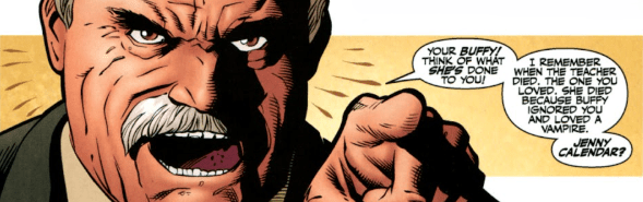 Fullworthe yells after him: the vampires came for this town and slaughtered them! And why? For giving counsel to the Slayers! He tells Giles to think of what he’s lost in service to Buffy, like that teacher he once loved, Jenny Calendar. Giles runs out of the building, heading towards Faith and Duncan is satisfied: he’ll be eaten by the demon, like everyone else.