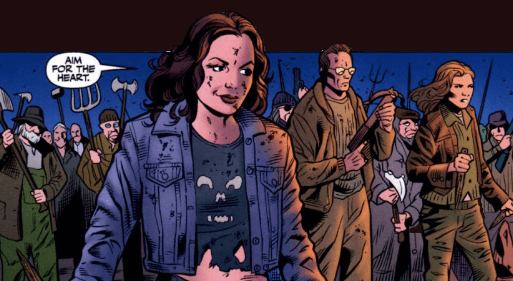 She turns, ready to fight, the townspeople around her armed. “Aim for the heart.”