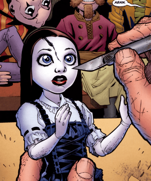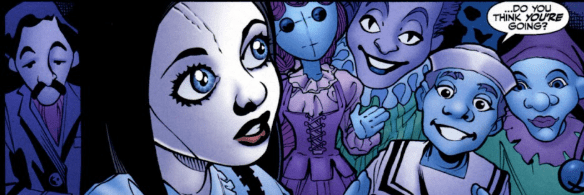 In the workshop, Dawn, despite her small frame, manages to clamber from her position on a shelf and climb down. One of the other toys stops her, asking her what she’s doing. Why would she want to leave? Their father keeps them safe. Dawn tries to explain that he must have put a spell on her and made her this way, but the toys surround her. They tell her that they can’t leave. They can never leave.