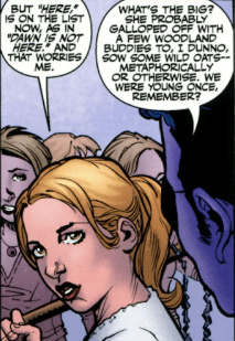Suddenly, Dawn’s centaur tracks disappear. Xander guesses that that means the third part of the thricewise curse has activated: she’s changed into something else via transmogrification. Buffy is now even more alarmed, ordering Xander to bring the thricewise, known as Kenny, into their custody. She wants to know how dangerous he is, but Xander tells her that it was a revenge spell because Dawn slept with his roommate – which Buffy did not know. Another thing Dawn didn’t want to share with me.