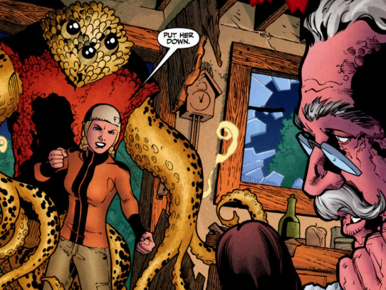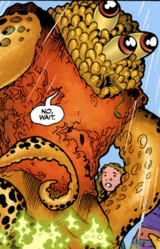 Kenny tries to distract them with a ruse, and transforms into his true self. It’s not very appealing to look at: a bulgy, three-eyed creature with tentacles and suckers. He pushes past the Slayers and manages to burst through a wall, escaping.