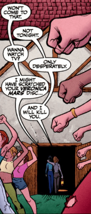 She looks sadly at Buffy: “You can’t keep me safe. And you don’t have to,” she tells her sister. Buffy tells her that she has to: she’s her sister. Dawn tells her that she knew that Kenny was a thricewise. She knew he’d be pissed off, and she cheated on him anyway. A few years ago, she explains, Buffy was the only Slayer. “Now I’m surrounded by, like, a thousand sorta-little-sisters I can’t possibly compete with. They fight in your army, they all come equipped with fancy new superpowers and would literally die to get your attention. It sucks.”