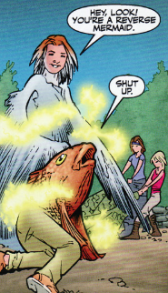 Buffy wants to be put down and starts flopping. The Willow bird lands and drops the fish, transforming them back to their normal forms and the witch is amused at Buffy’s mid transformation, half-human, half-fish look. Buffy is worried however – the local demons are searching for them and if Twilight finds them, she’s not really sure what they’re going to do.