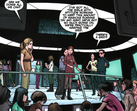 Inside the safehouse, the separate Slayer squads are all together. Satsu and Kennedy have flown in from Tokyo. Willow has a mystical field to alert them to any approach. She has Wiccan Slayers backing her up. Buffy’s being weary about how much power Willow is using, but Willow assures her that she’s fine. Buffy addresses the girls: for now, the best thing they can do is disappear. But then Satsu asks a question: how long are they hiding for? What is their actual next step? No immediate answer is given.
