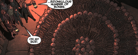 Elsewhere, in the darkness of the Catacombs of Rome, a group of Slayers and their Watcher Andrew, are investigating a disturbance that’s they’ve detected. They walk slowly, lanterns drawn, and find some ancient verse engraved on a wall. Andrew explains that it’s the prayers of Christian Martyrs and they come across a room. It’s filled with human skeletons and bones, all decorated into some kind of sigil. The Slayers are grossed out, but Andrew explains that this was their wish, their faith.