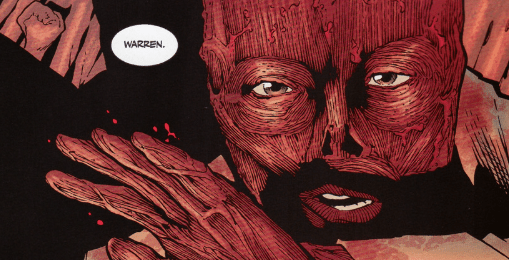 One of the Slayers hears a sound and asks if anything is supposed to be down there with them. Andrew tells her that he’ll go ahead and check. He walks towards the darkness, carefully, aware of every single noise. He hears something wet, squelching on the floor. As Andrew brings his torch up, he finds a foot, covered in blood, skin removed. He follows the foot up, across the creature’s chest, but Andrew already knows what he’s going to see. As the light hits the creature’s skinless face, Andrew gasps in shock and nearly drops his torch. “Warren.”