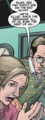 Satsu appears: she has a prisoner, but before anyone can move, Willow says she wants it, and teleports both herself and the prisoner away, leaving Giles confused. Buffy tells him not to worry – Will knows what she’s doing.