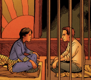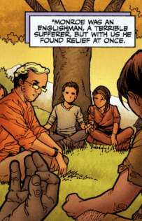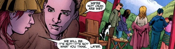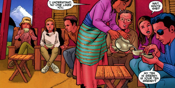 In Tibet, high above the mountains and far across the sea, Buffy and her friends are sitting on the front porch of their former ally and classmate, Oz. This is where he calls home, a monastery, located in the heart of the mighty Tibetan Plateau. A dark-haired woman is serving them tea. Xander thinks his tea is greasy. Buffy is explaining how despite their power coming from magic, they need to learn how to suppress it. In Giles’ words, it’s “become a liability.”