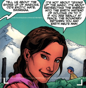 Oz pulls her back into a hug, their first in years. “You can be done, Willow. You can just be Willow Rosenberg. Just let the Earth take the magic and you’ll feel it sliding away…” Willow pulls away. “No,” she says. Oz tells her “Yes,” in return. He asks her if she’d like to watch Kelden and Willow, with tears in her eyes, looks surprised. “You’d trust me?”