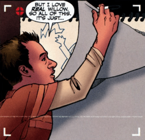 There’s a small silence and then Buffy tells her about the Dark Willow she met and killed in the future. Willow shrugs off her concerns. “It wasn’t me.” Buffy looks at her. “What?”