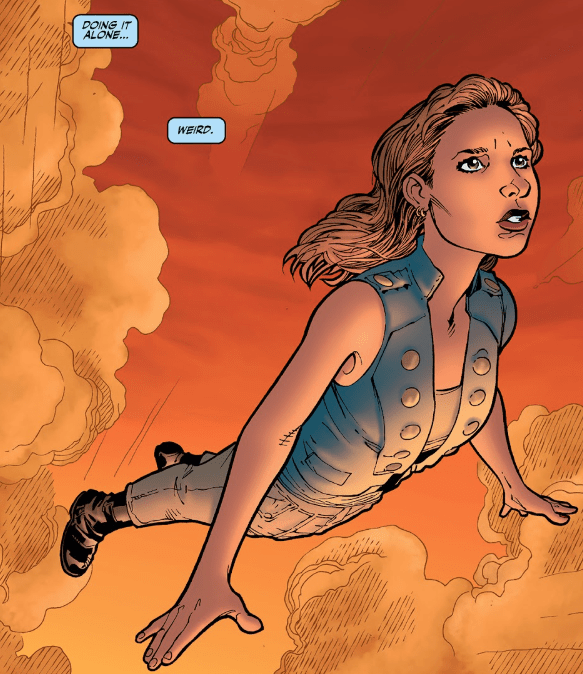 Doing it with Willow was scary, but doing it alone is so… weird. Buffy‘s thoughts are trying to work out how she’s feeling, considering she’s flying, naturally, through the air like Superman.