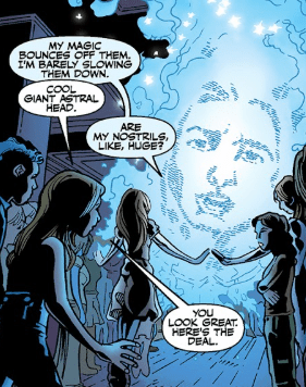 Dawn interrupts the moment with an exaggerated cough. Buffy tells her that she approves of the two of them – she’s fine. Dawn says she didn’t ask. She has bigger problems: three of them, all goddess size. Willow cannot contain them alone. Buffy has an idea.
