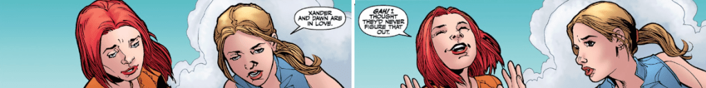 Buffy asks about her new abilities: Willow shrugs. She needs more tests done. She also doesn’t think it’s related to the same event that repowered her. Buffy looks down, slightly dejected. She tells Willow that Xander and Dawn are in love.