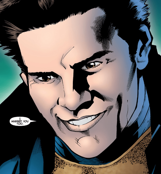 Twilight Headquarters. The villain is asking his three guests, Giles, Faith, or the guy who’s name he can’t remember, who wants to die first. Andrew notices that Twilight has forgotten his name, which means they’ve met. “That’s the second time,” he notices. “Andrew. My name is Andrew.” Giles has a look of absolute horror on his face – “I know that voice,” he whispers, in shock. Faith steps back. Twilight looks straight at Rupert, who is on the floor, looking at him, stunned. “Of course you do, Giles… That’s what happens when you get rid of your resident witch,” he says, referring to Amy. “People start seeing the truth.”