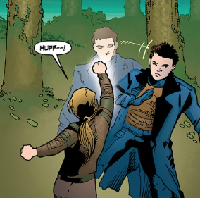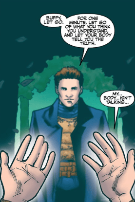Buffy slams into him, knocking him through more trees. If everything he wants is so great, then why hide from her? He explains that he had a bad time after LA returned from Hell. But he’s better now. Buffy doesn’t care: why put her through the last year? She’s yelling now, old wounds reopening as they talk.