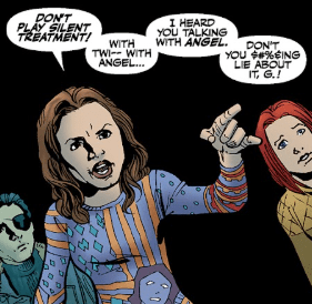 Faith shudders. In fact, the whole room seems to shake. All of reality? She notices she’s not bleeding anymore. Her wound is gone and Satsu suddenly has her tech back online. Faith asks Giles what the Hell is happening. She’s getting angry at his silent treatment and says she heard what Angel said. She wants to know what he knows. Now.
