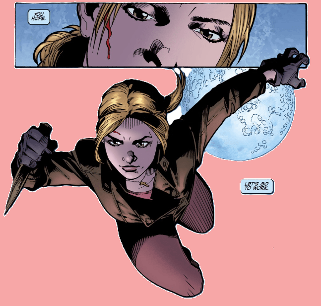 Jumping from one roof top to another, Buffy is lost in her thoughts.
