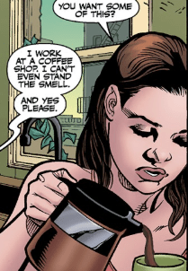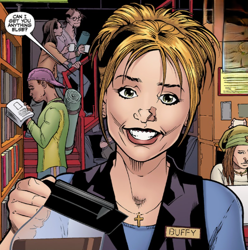 She’s still smiling though. Yes, she’s waitressing again. The world has still changed. She’s not mystically transported back in time. Keep saying it Buffy. You may eventually believe it. But on the plus side, she’s not clinically depressed and wearing a chicken on her head, so it’s a step up from the Doublemeat Palace. Reason enough to smile like a crazy person. And cute-guy-talking is better than living-with-Slayers-talking. She considers it all a win. It’s just waitressing, after all. What else did she expect?