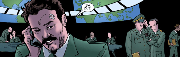 Somewhere unknown, in an underground military base, the General is walking away from his disapproving-looking superiors. He’s on the phone to his wife: he’s been made the example. He’s to be given medals and pensions and smiles for the press, but he’s an embarrassment to them as far as they’re concerned. He’s about to enter an elevator to the surface so he hangs up. “It’s over,” he says. The elevator door pings.