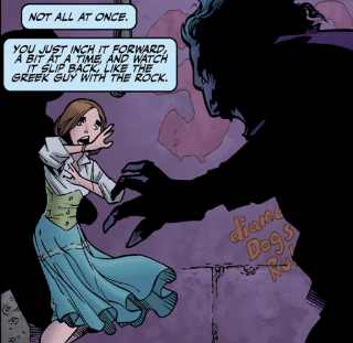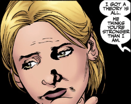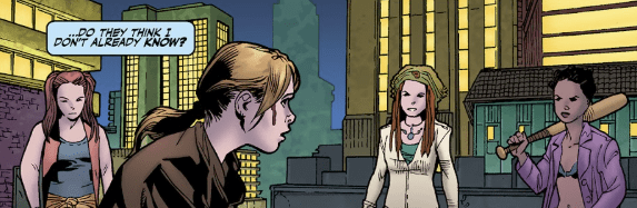 “The war. Being a leader. With an army, I mean. You were born to be a leader. Without the army you’re back to just being bossy.” Buffy starts to argue, but Dawn just looks at her. It was just a nightmare, Buffy insists. And she’s quite prepared, even without a gang, to go solo for a while.