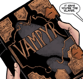 It a bound leather volume, with golden highlights. It’s locked, with two key holes on the latch, keeping the book sealed. It has the word ‘Vampyr’ written on it. Buffy recognises it straight away.