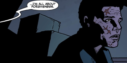 Buffy asks if she can handle it, but Faith says she’s not really sure of anything. But she seems to be the only person who can even look at the guy. She looks over at a dark room in the corner, the door slightly ajar. Angel sits there, still covered in blood, still mouth open – exactly the same as he was when the entity left him. Stunned. Confused. Traumatised. Faith reminds Buffy that she’s all about forgiveness.