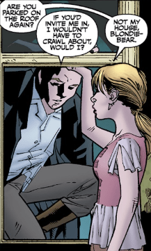 In San Francisco, some time later, Buffy hears a knock at the window. It’s Spike. He’s parked on the roof again, hasn’t he, bets Buffy. He says that if he was invited in, he wouldn’t have to sneak, but Buffy smiles. “It’s not my house, blondie-bear.” She scoots out of the window, and joins him on the fire escape. “I have begged you not to call me that. Reminds me of that moron who – among other things – has completely ruined Dancing with the Stars for me this season.”