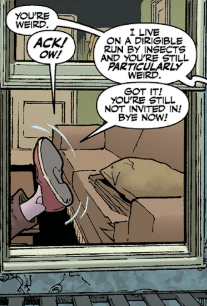 She says she’s fine, clambers through the window and falls awkward off the ledge. Spike is bemused. “You’re weird. I live on a dirigible run by insects and you’re still particularly weird.”